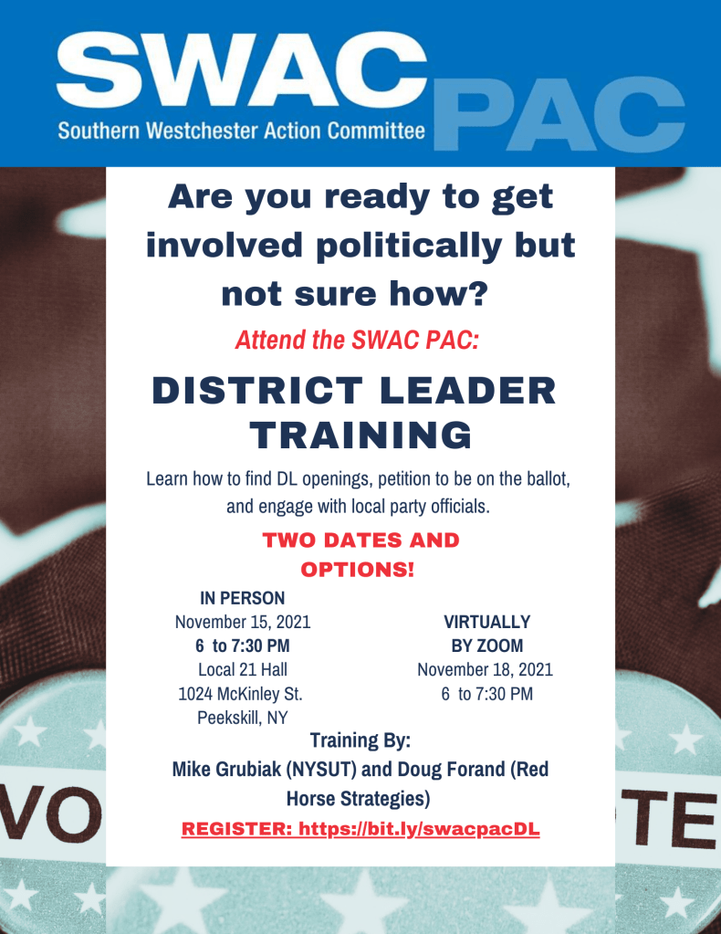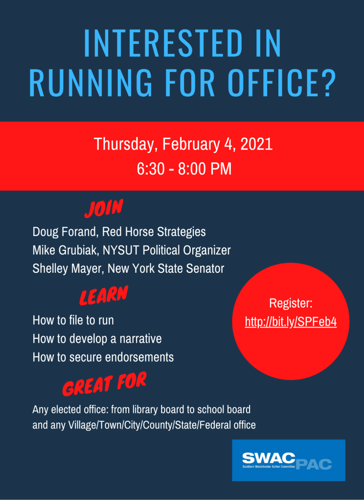 Have you every considered running for office? Are you interested in learning more about what is involved in running for office? If you answered yes to either question please join us for a virtual training on Thursday, February 4, 2021 and learn about running for office from Mike Grubiak, Doug Forand and State Senator Shelley Mayer.