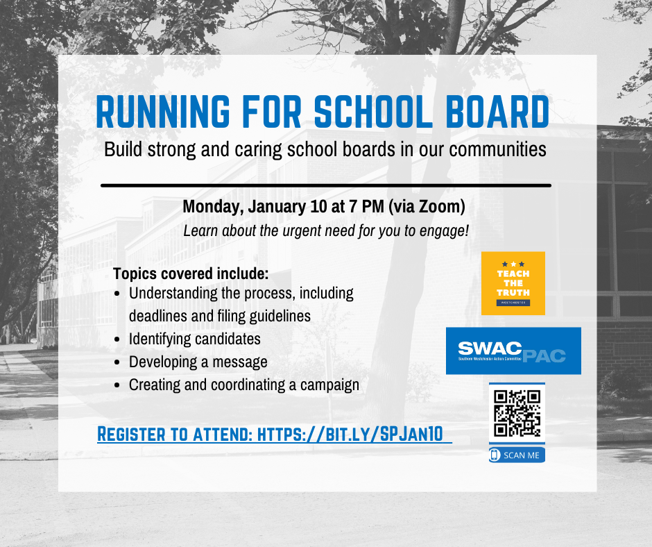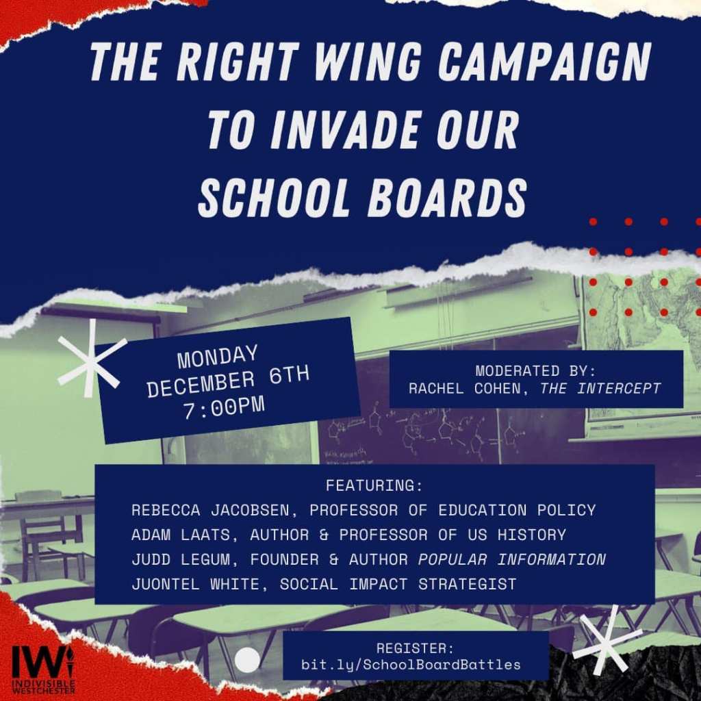 Join us for a roundtable discussion to discuss the use of false information and intimidation to stop schools from teaching about diversity, respect, and inclusion. Four experts will share their wisdom on Monday, December 6th at 7pm. RSVP at bit.ly/SchoolBoardBattles